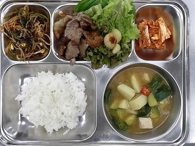 중식 : 쌀밥,두부된장찌개,돈삼겹,목살구이,보쌈김치, 상추깻잎쌈+쌈장