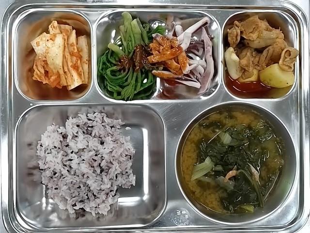 중식 : 찰흑미밥,근대된장국,닭볶음탕&구멍떡,오징어두릅숙회/초장,배추김치