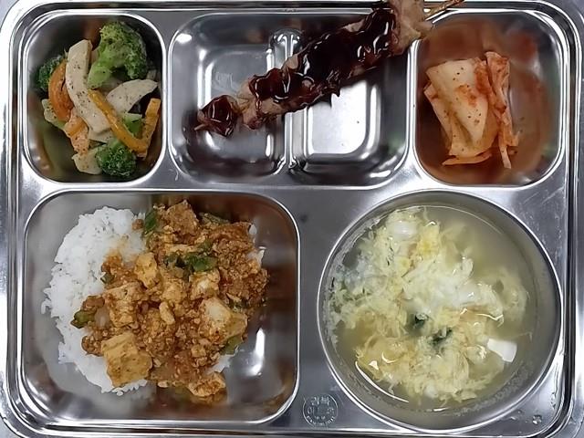 석식 : 마파두부덮밥,계란실파국,브로콜리새송이들깨무침,데리야끼딝꼬치,배추김치