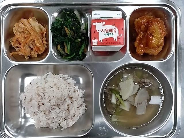 조식 : 차수수밥,얼큰소고기무국,돈육강정,시금치나물,배추김치,수박우유