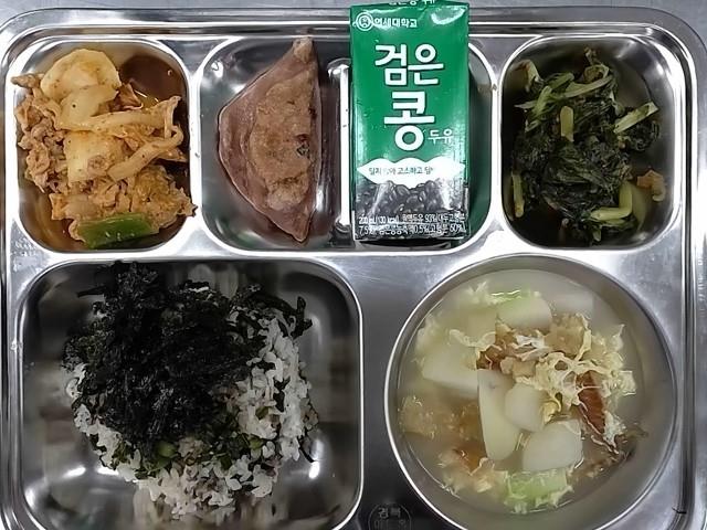 중식 : 소고기곤드레나물밥(양념장),북어감자국,돈육김치볶음,수수부꾸미,열무김치,검은콩두유