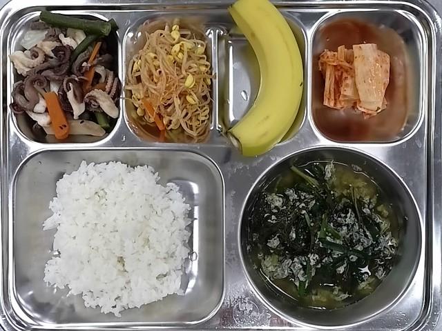 석식 : 쌀밥,올갱이부추국,쭈꾸미마늘쫑간장불고기,콩나물무침,배추김치,바나나