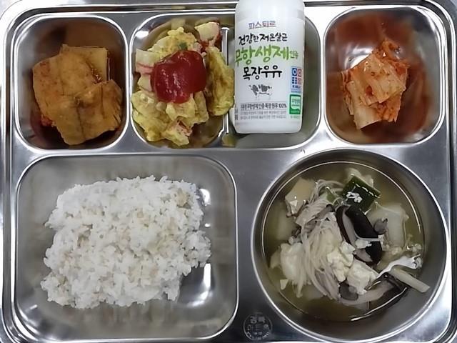조식 : 보리밥,모듬버섯맑은국,삼치무조림,스크림블에그/케찹,배추김치,흰우유