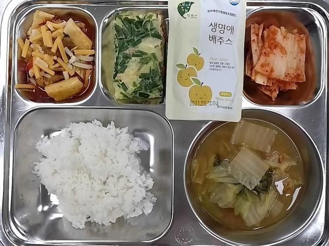 조식 : 쌀밥,배추된장국,치즈불닭,야채계란찜,배추김치.친환경배주스