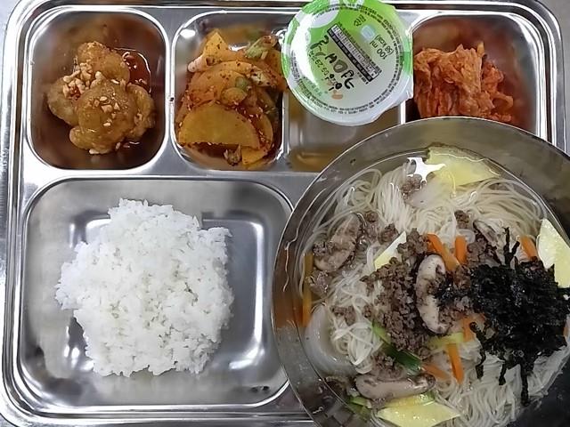 중식 : 쌀밥1/2,잔치국수,깐풍코다리살강정+소스,단무지무침,배추김치,매실주스