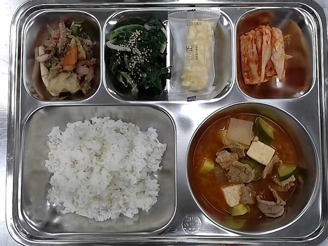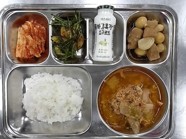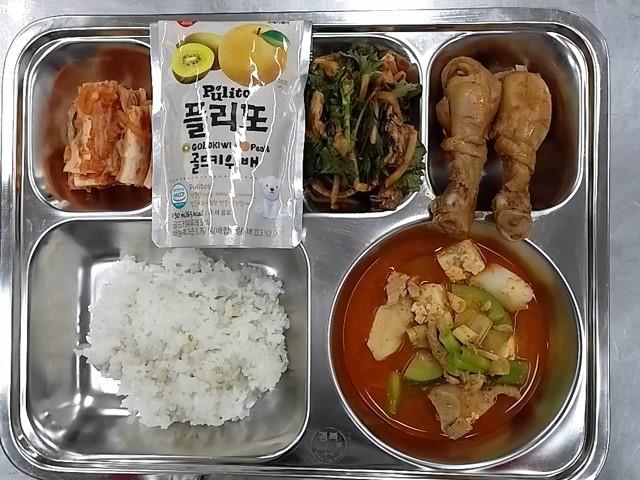 중식 : 보리밥,돼지짜글이,닭다리조림,쑥갓느타리무침,배추김치,골드키위배주스