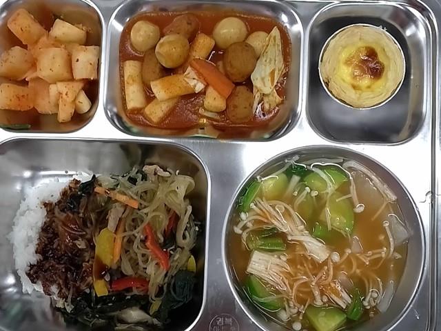 중식 : 잡채덮밥,팽이버섯된장국,모듬떡볶이,깍두기,에그타르트