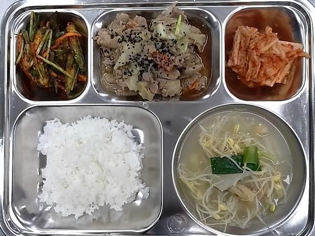 조식 : 쌀밥,북어콩나물국,돼지불고기,오이부추무침,배추김치