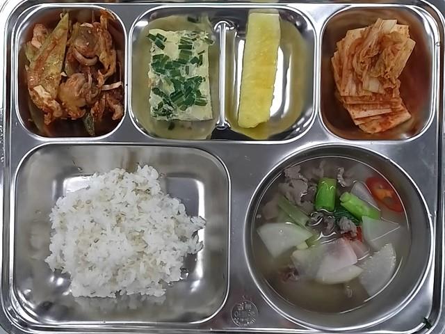 조식 : 보리밥, 소고기무국,맛살계란찜,꼬막채소무침,배추김치,골드파인애플
