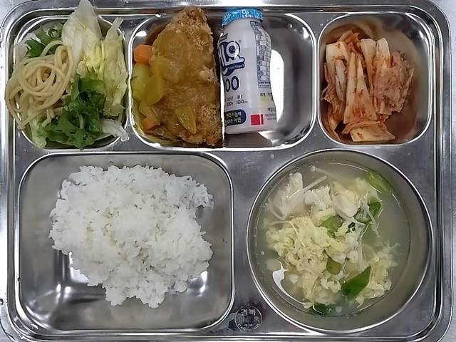 석식 : 쌀밥(자율),순두부계란탕,고구마치즈커틀릿/빈달루카레소,샐러드스파게티배추김치,요구르트(80ml)