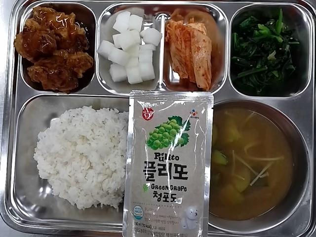 석식 : 발아현미밥,팽이버섯된장국,교촌식닭봉,치킨무,시금치무침,배추김치