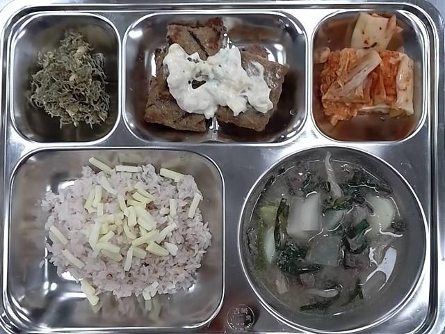 조식 : 차수수밥,소고기부추들깨탕,콘치즈마요떡갈비,혼합멸치볶음,배추김치