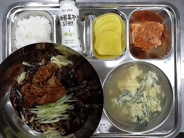 중식 : 쌀밥1/2,계란부추국,숯불짜장면,단무지무침,배추김치,AYO요구르트