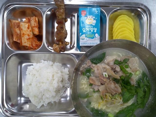 중식 : 쌀밥(자율), 돈코츠라멘, 옆잎통살닭꼬치, 단무지무침, 배추김치, 요거얌얌 쥬스