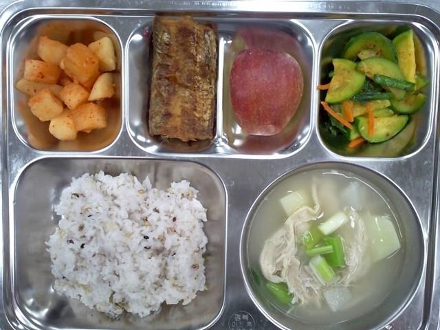 조식 : 혼합잡곡밥, 닭곰탕, 애호박볶음, 갈치구이, 깍두기, 친환경사과