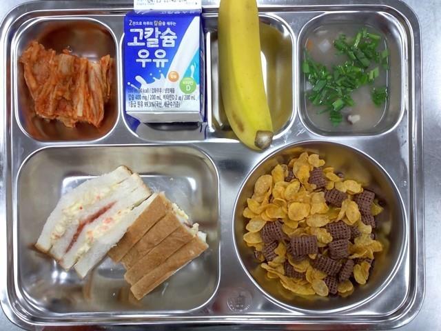 조식 : 인기가요샌드위치, 소고기채소죽, 배추김치, 시리얼+우유, 바나나