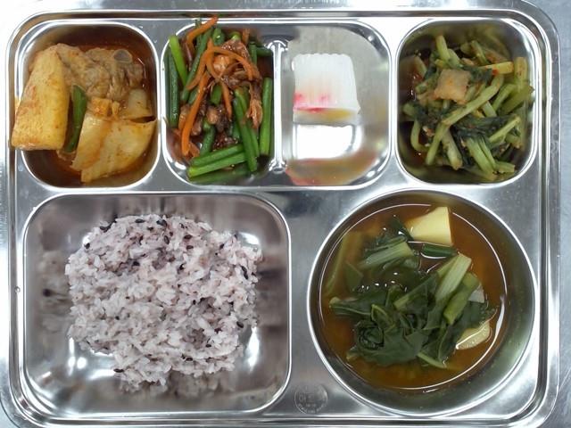 중식 : 찰흑미밥, 감자근대국, 등갈비김치조림, 건새우마늘쫑볶음, 열무김치, 요거트푸딩