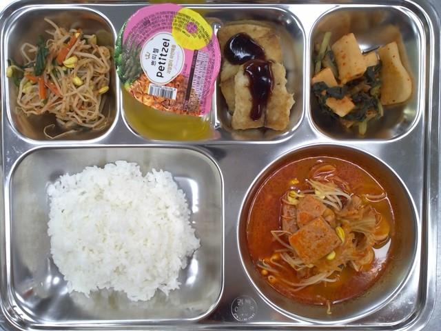 석식 : 쌀밥, 부대찌개, 삼치데리야끼구이, 콩나물부추무침, 총각김치, 쁘띠첼과일잴리(파인애플)