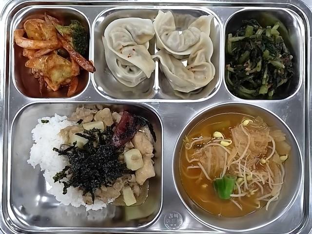 중식: 안동찜닭덮밥,김치콩나물국,오징어브로콜리초무침,열무김치,갈비만두