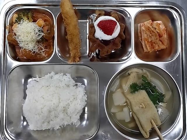 석식: 쌀밥,꼬치어묵국,로제떡볶이,새우튀김,배추김치,딸기생크림우리밀와플