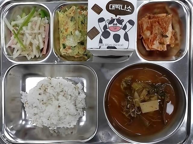 조식: 율무밥,소고기육개장,야채계란찜,감자채햄볶음,배추김치,초코우유