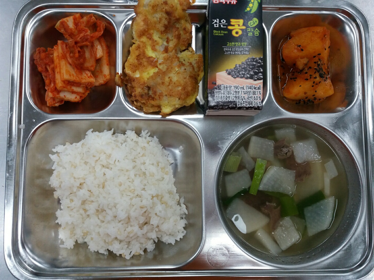 조식: 현미찹쌀밥, 쇠고기무국, 감자조림, 생선전, 배추김치, 검은콩두유