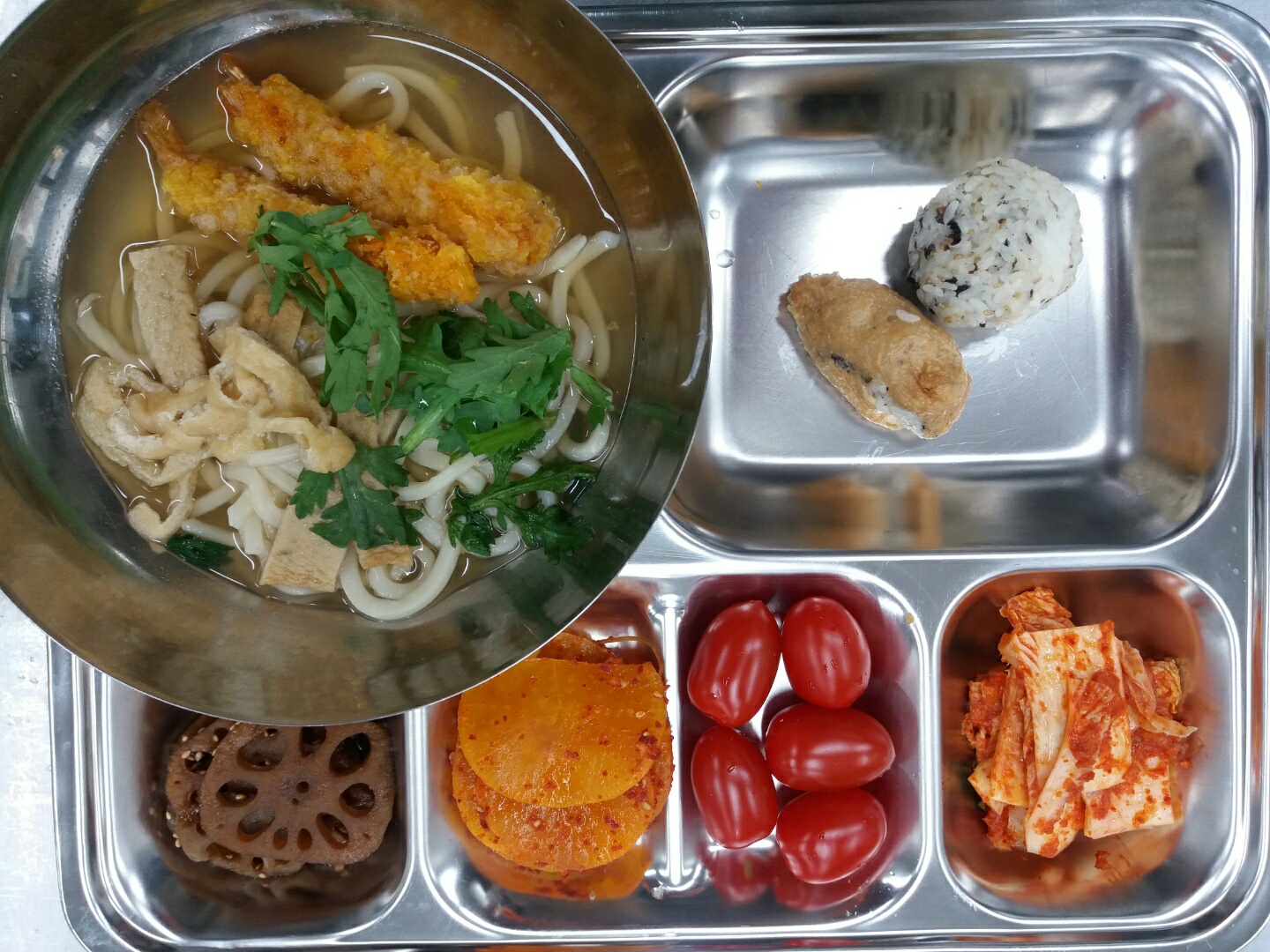 중싱: 유부초밥, 단무지무침, 새우튀김우동, 연근조림, 배추김치, 방울토마토