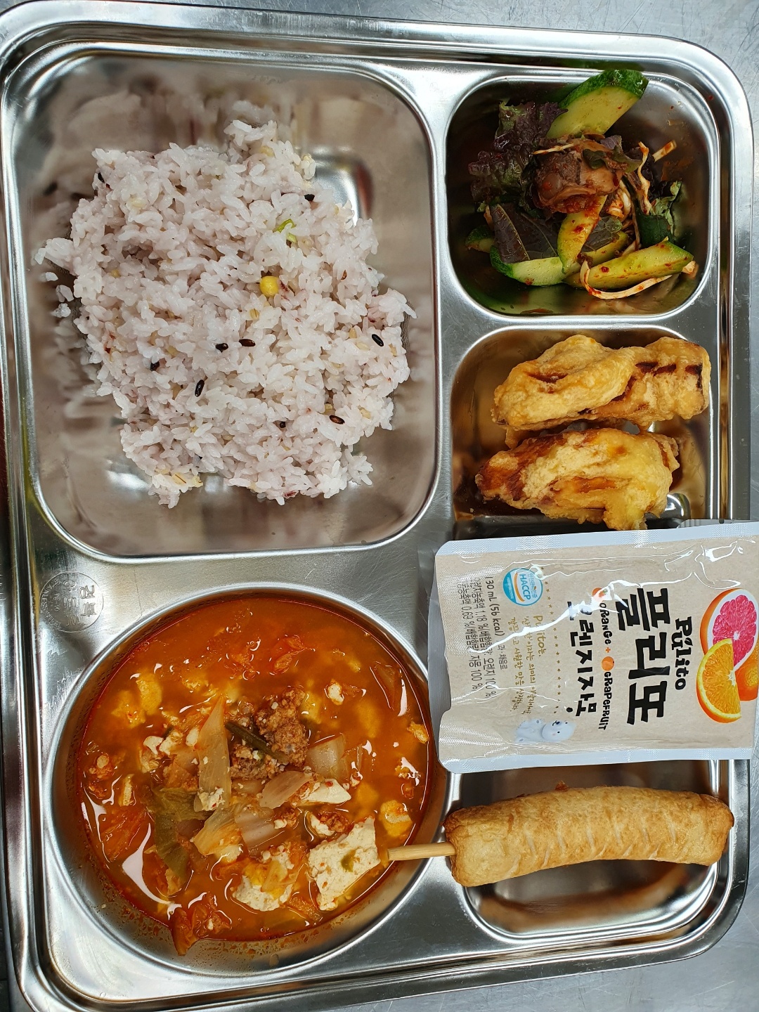 석식: 혼합잡곡밥,순두부찌개, 꼬막야채무침, 단호박튀김, 스트링치즈어묵바, 오렌지자몽