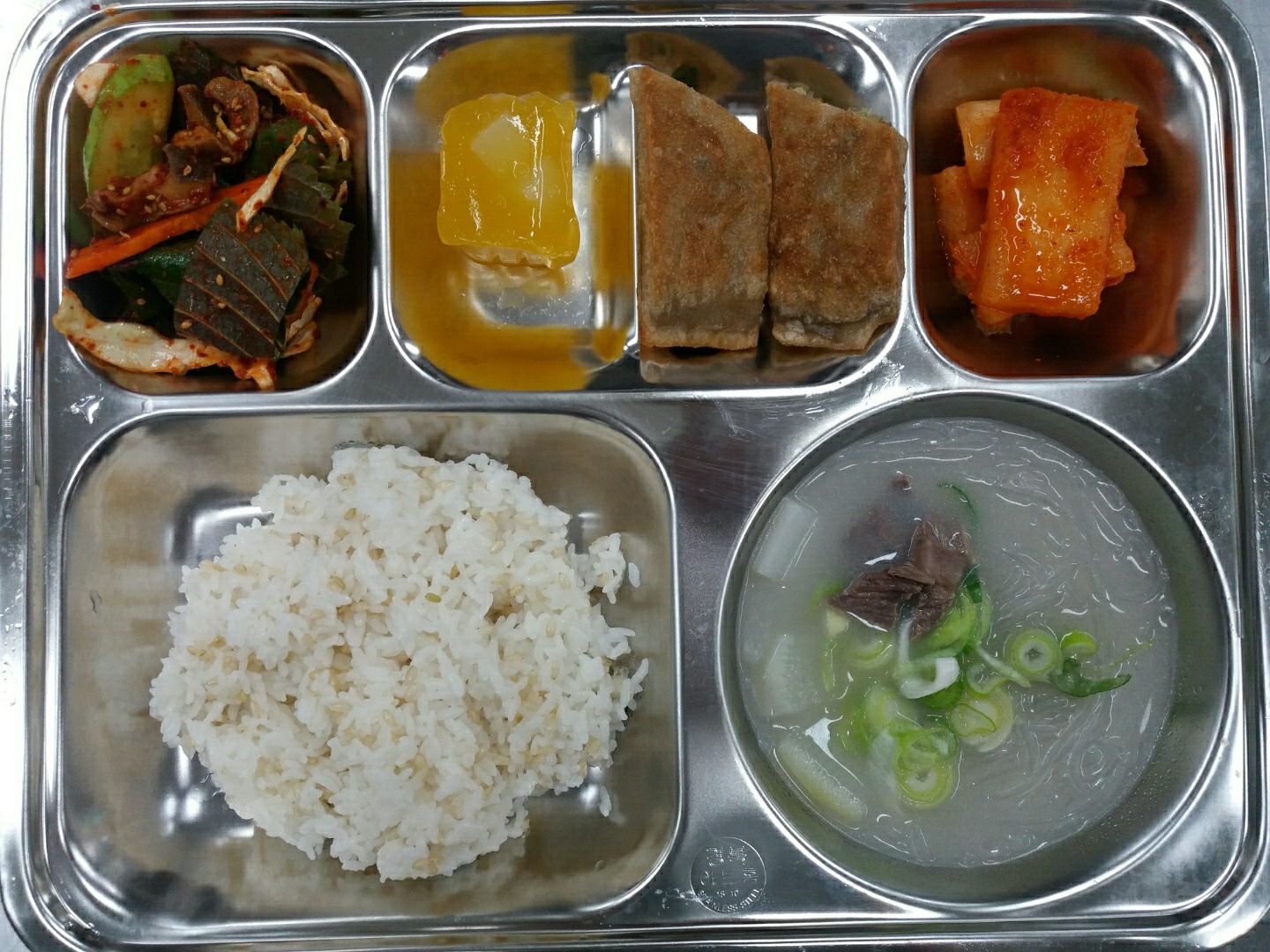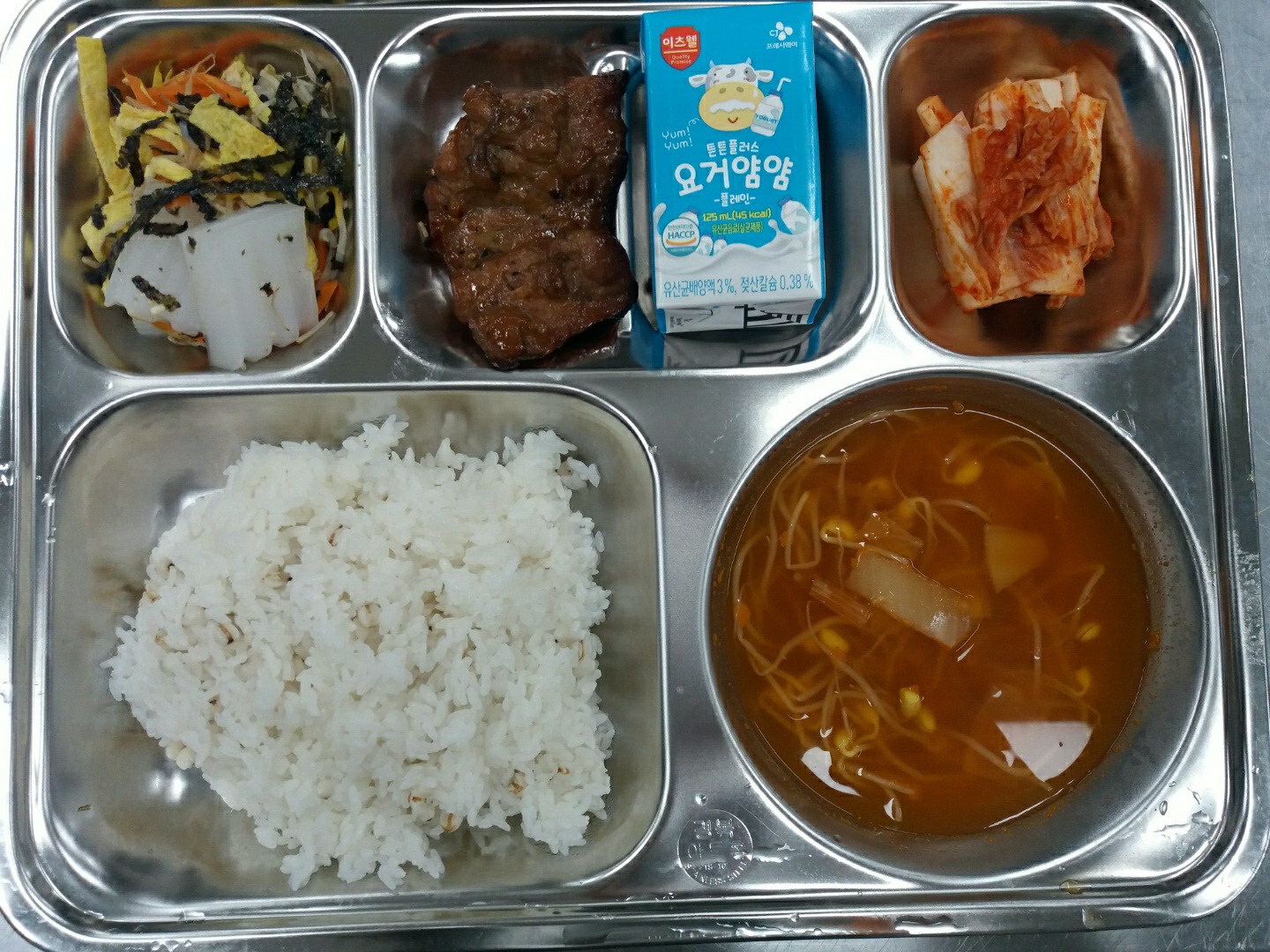 석식: 율무밥,김치콩나물국,청포묵김가루무침,갈비맛치킨스테이크,요거얌얌(오렌지),배추김치