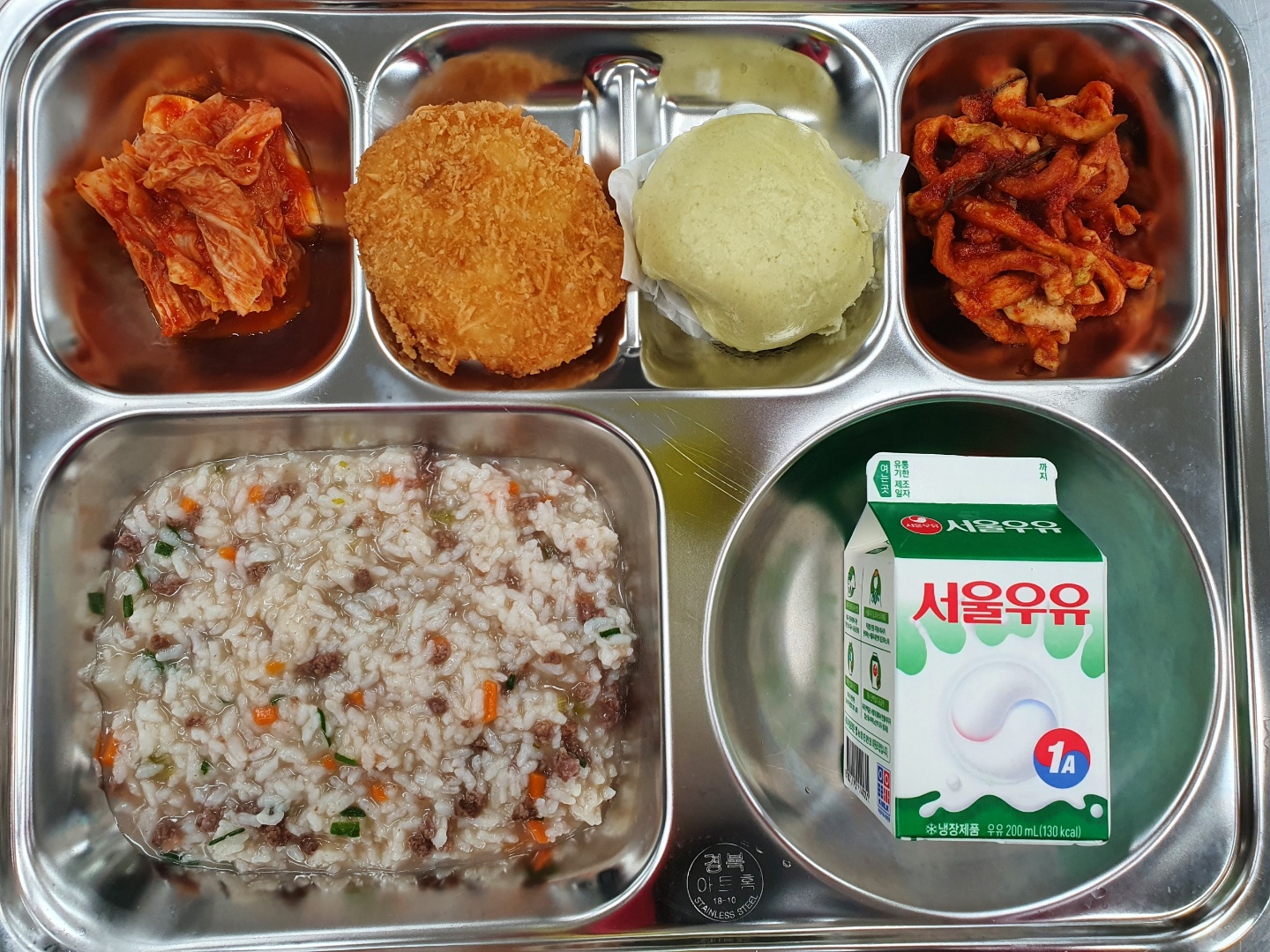 조식: 매실무말랭이양념무침,코코넛흰다리새우까스,배추김치,쇠고기야채죽,우유,새싹순보리쌀찐빵
