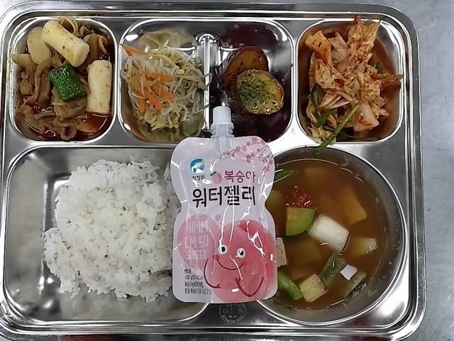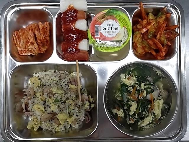 석식: 해물필라프, 도라지오이무침, 대박소떡소떡꼬치, 배추김치, 대게살스프, 쁘티첼(복숭아)