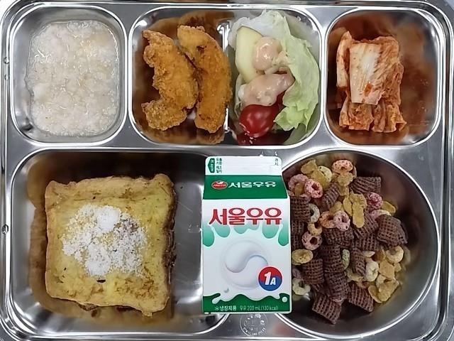 조식: 숭늉,프랜치토스트,치킨텐더스틱,배추김치, 시리얼/우유, 사과양상추샐러드