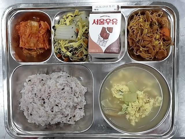 조식: 혼합잡곡밥, 북어무국, 청포뭄김가루무침, 돈육통나물두루치기, 배추김치, 초코우유