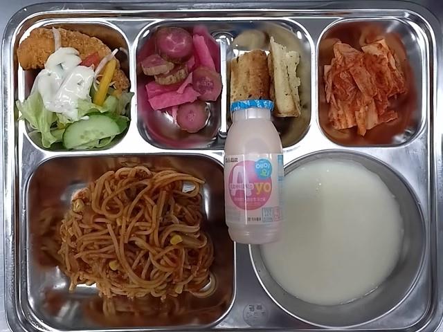 중식: 미트소스스파게티, 배추김치, 샘삭모듬피클, 크림스프, 마늘빵, 요구르트, 치킨샐러드