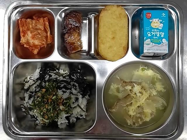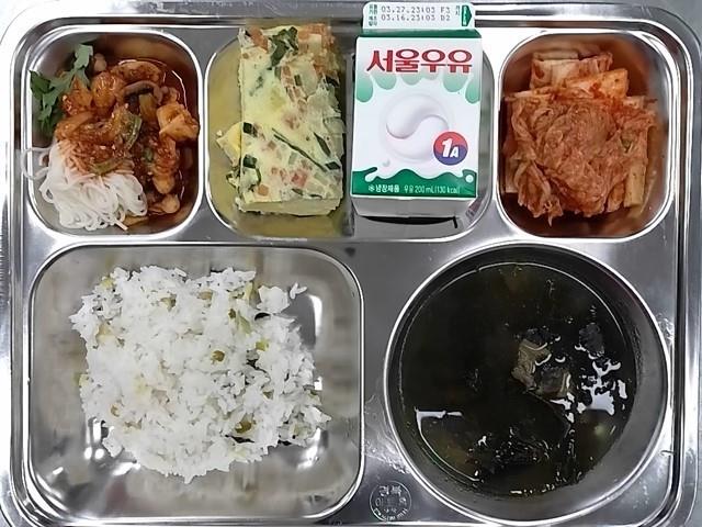 조식; 서리태밥, 쇠고기미역국,맛살계란찜, 낙지볶음, 배추김지, 우유