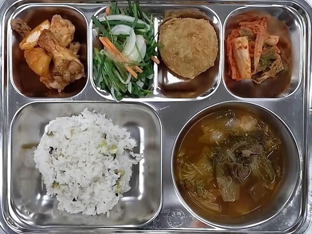 중식: 서리태밥, 사골우거지국, 닭봉바비큐소스조림, 양파부추무침, 고추잡채크로케타