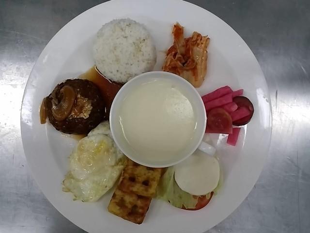 중식: 현미찹쌀밥, 콘스프, 고메함박스테이크, 미니와플 해쉬브라운, 배추김치, 토마토모짜렐라치즈샐러드