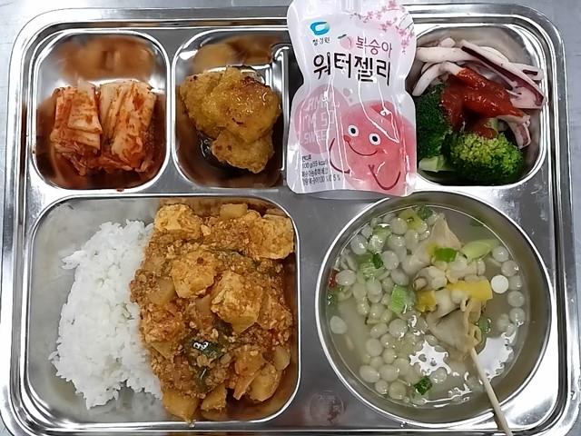 석식: 마파두부덮밥, 꼬치어묵국, 오징어브로콜리숙회, 허니치킨가라아게, 배추김치, 워터젤리