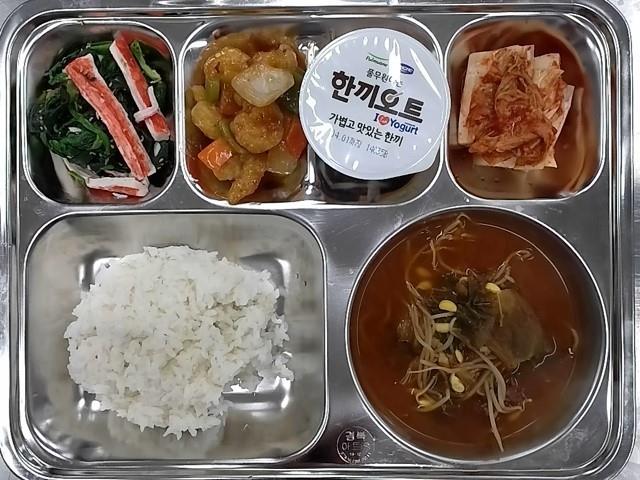 조식: 현미찹쌀밥. 쇠고기해장국, 깐쇼새우강정, 시금치 맛살무침, 배추김치, 요거트(파인애플)