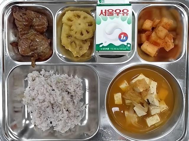 조식: 혼합잡곡밥, 두부김치국, 연근튀김, 갈비맛치킨스테이크, 깍두기, 우유