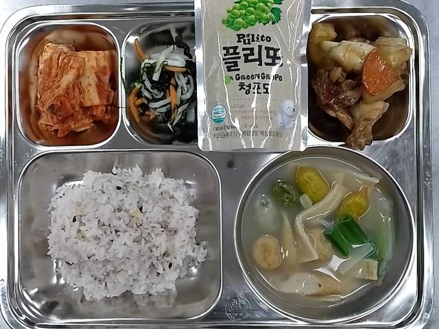 석식: 혼합잡곡밥, 옹심이물만두어묵탕, 닭봉데리야끼소스조림, 파래무침, 배추김치, 델몬트포도주스