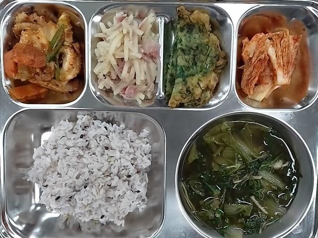 중식: 혼합잡곡밥, 냉이된장국, 감자베이컨볶음, 주꾸미볶음, 쑥전, 배추김치