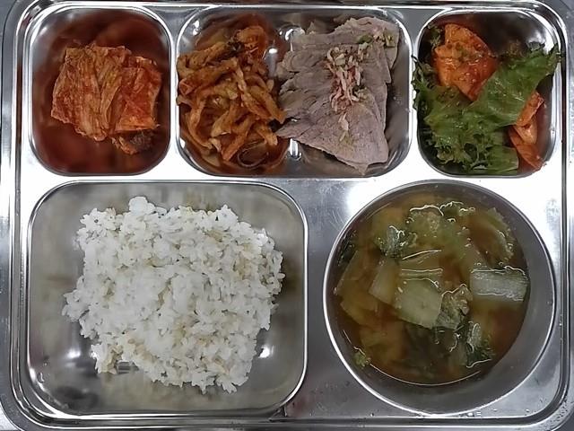 중식: 찰보리밥, 콩가루배추국, 매실무말랭이 양념무침,수육+새우젓, 치커리사과무침, 보쌈김치