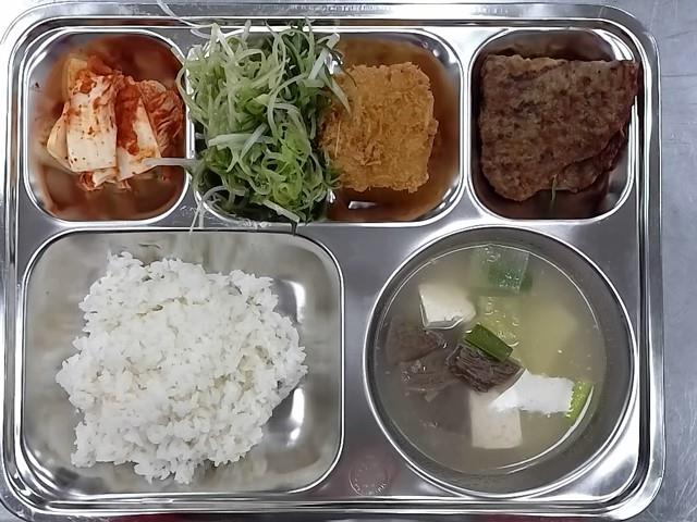 석식: 현미찹쌀밥, 쇠고기감자국, 파채샐러드, 순살가자미까스, 언양식불고기, 배추김치