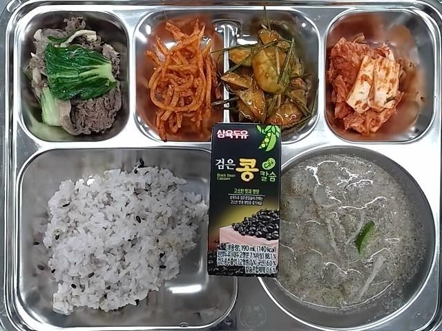 조식: 혼합잡곡밥, 들깨옹심이국, 오이달래무침, 진미채볶음, 소불고기청경채볶음, 배추김치, 검은콩두유