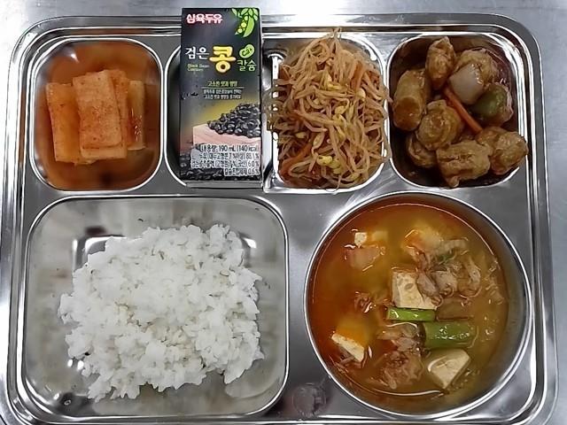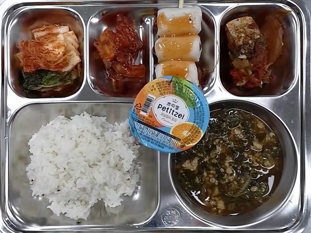석식: 율무밥, 콩가루쑥국, 삼치조림, 도라지강정, 배추김치, 쁘티첼(밀감),빙빙소떡꼬치