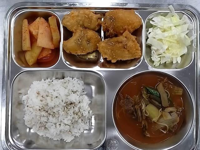 중식: 율무밥, 육개장, 닭날개튀김+머스타드, 석박지, 양배추샐러드