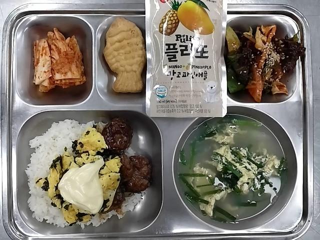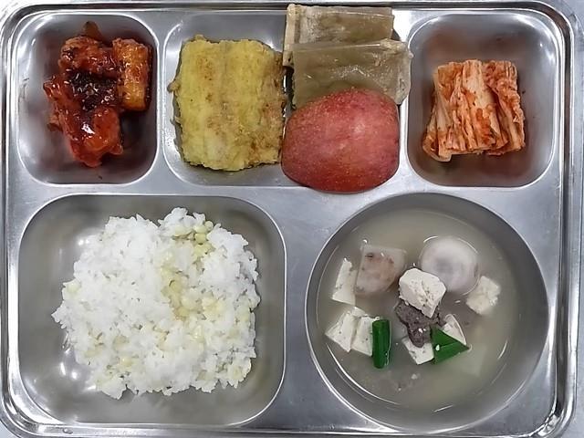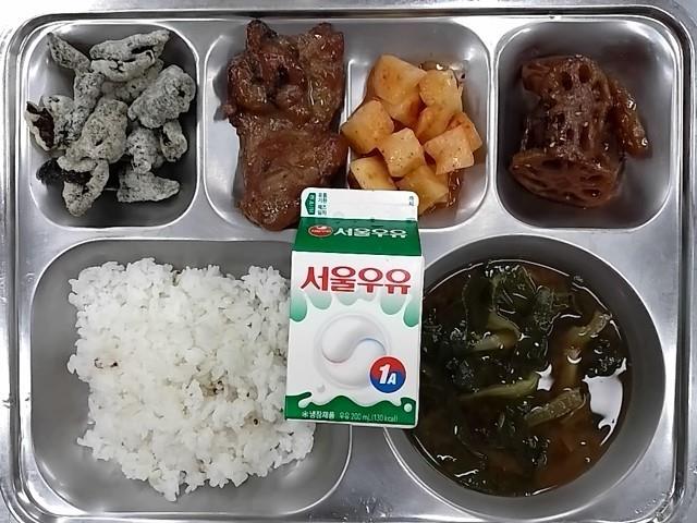 조식: 율무밥, 근대된장국, 갈비맛치킨스테이크, 연근조림, 김부각, 깍두기, 우유