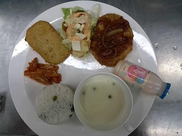 중식: 완두콩밥, 크림스프, 등심치즈돈까스, 해쉬브라운, 사과양상추샐러드, 배추김치, 요구르트