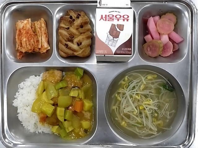 조식: 순살치킨카레덮밥, 무콩나물국, 배추김치, 삼색모듬피클, 메이플피칸, 초코우유